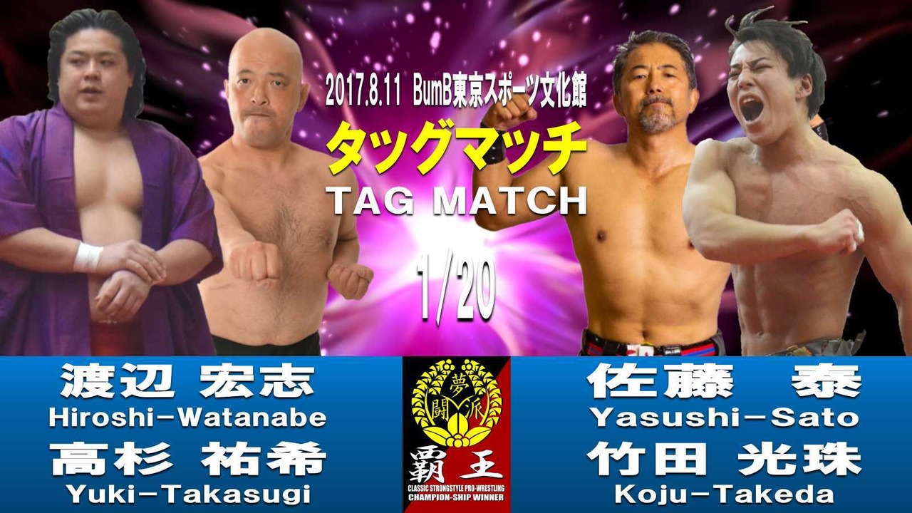 定番ともいえる渡辺宏志✕佐藤泰の組み合わせにそれぞれ中堅クラスのパートナーを従えた濃厚なタッグマッチ。